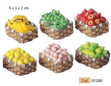 Basket of assorted fruits. Measures 4x3x2 cm. 6 models for figures 10-15 cm. Price by unit..