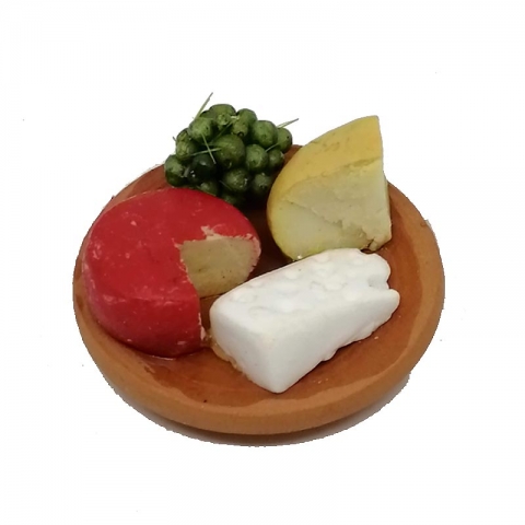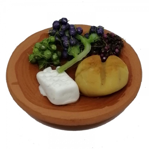 Plate Model A: Bread with cheese and grapes. Measurements Plate 5 mm height and 3.6 cm Ø.