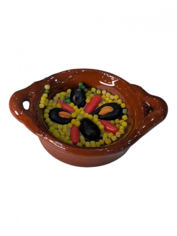 Clay paella pan. Pan dimensions: 6.5 cm long and 4.5 cm diameter x 2 cm high.