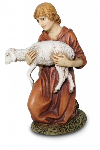 Shepherd kneeling with lamb made in polychrome resin for figures of 10 cm. Piece modeled by Martino Landi.