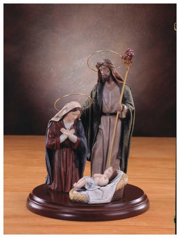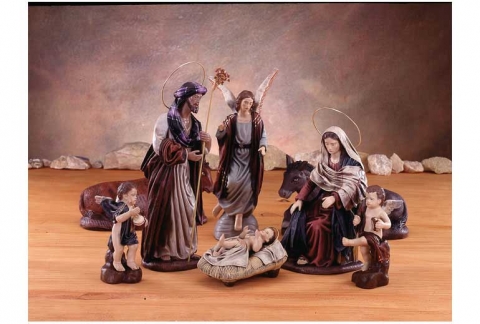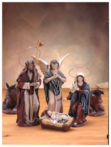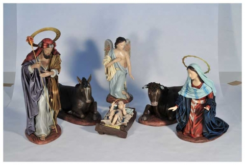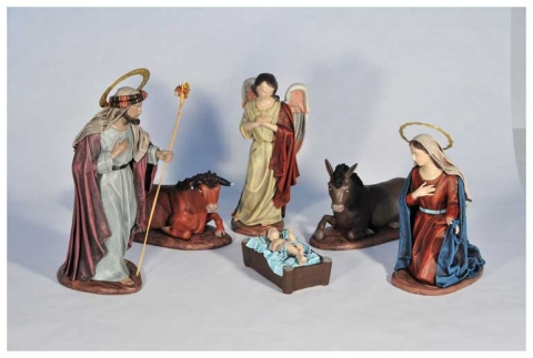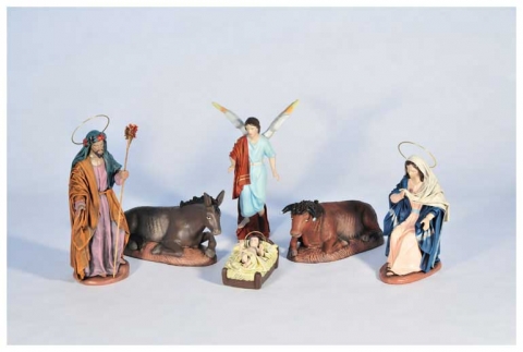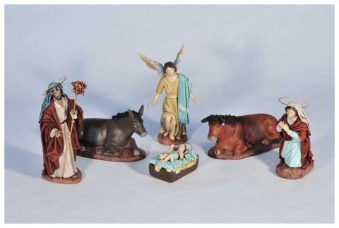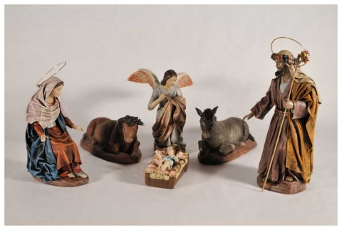 Nativity in polychrome mud with cloth design by Galán.Available in various sizes.