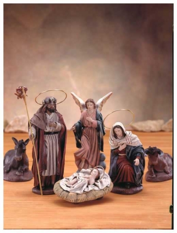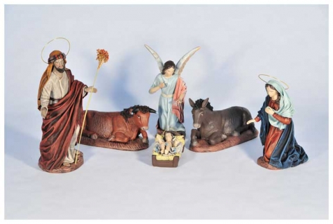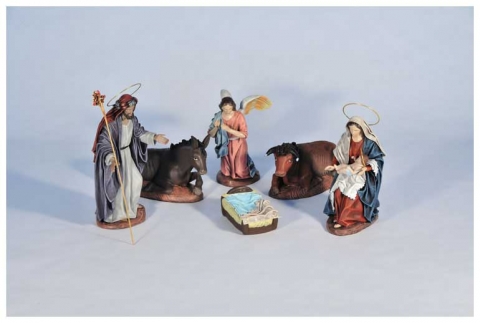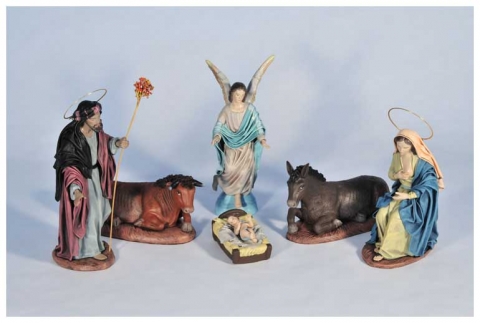 Nacimiento cinco piezas en barro con tela policromada de Belenes Galán.Disponible en varios tamaños.