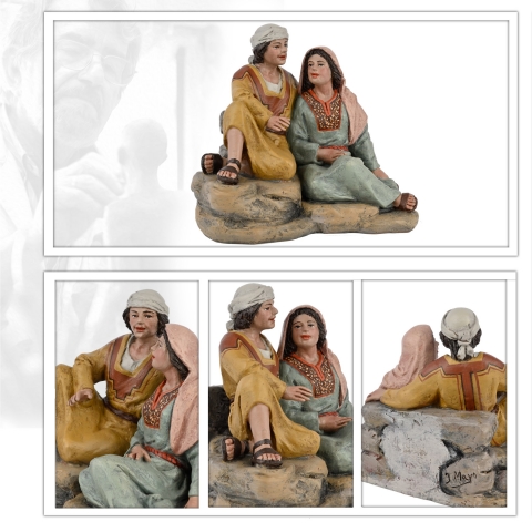 Grupo Canán. Pastor y pastora sentados sobre una roca hablando en 16 cm. diseñado por J. Mayo en pasta cerámica y policromía acrílica modelada por el taller artístico Mayo.