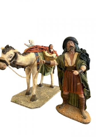 Shepherd with camel and two children. Serrano design in clay and canvas. Available in various sizes.