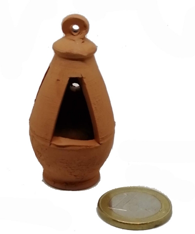 Oval lantern made of clay by hand. Approximate measurements: 5.37 cm. high and 2.8 cm wide. With hole to install a microbulb.