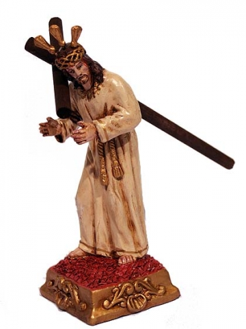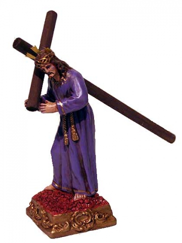 Cristo con cruz a cuestas y tunica morada de 20 cm en barro policromado realizado por Lozano.