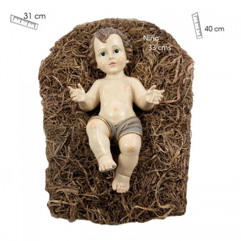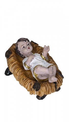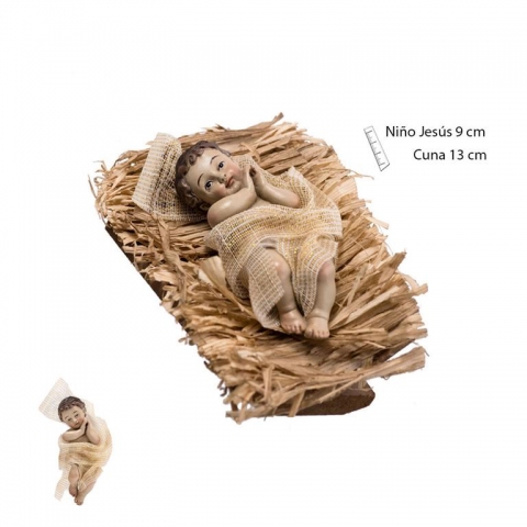 Niño Jesus vestido con cuna en resina policromada. Disponible en varios tamaños