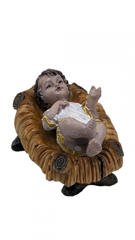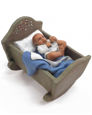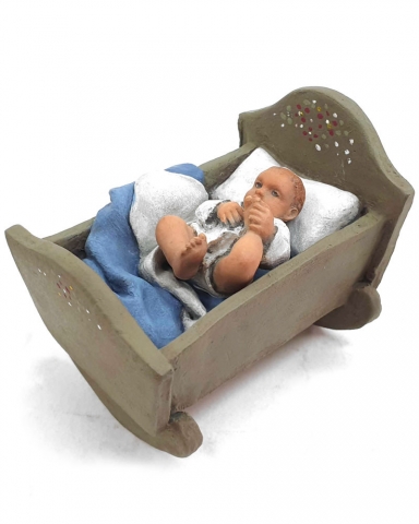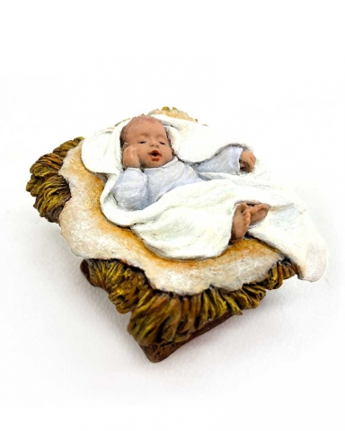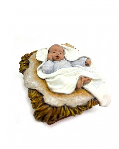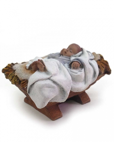 Child Jesus dressed with a cradle in polychrome resin. Available in various sizes