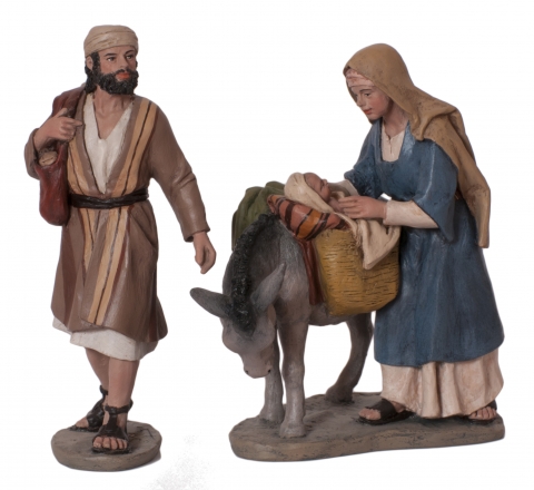 Grupo huida a egipto 19 cm diseñado por J. Mayo. Novedad 2019.Pasta de cerámica. Grupo realizado en terracota y policromía acrílica modelada por el taller artístico Mayo.
