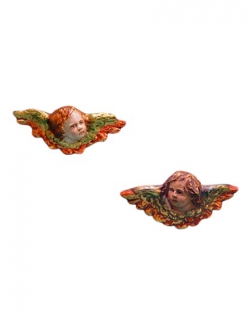 Pareja de Cabezas de ángel en barro policromado. Medida (LxH): 9.5 x 7 cm. Taller de Mariscal.