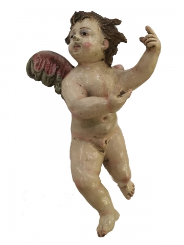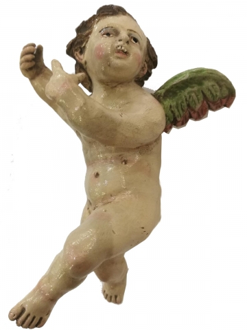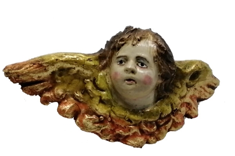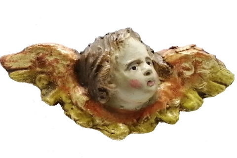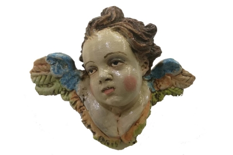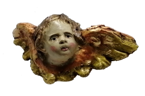 Cherub angel head looking to the right made of polychrome clay. Measurements (L x H ) = 8.5 x 3.5 cm. Marshal Workshop.