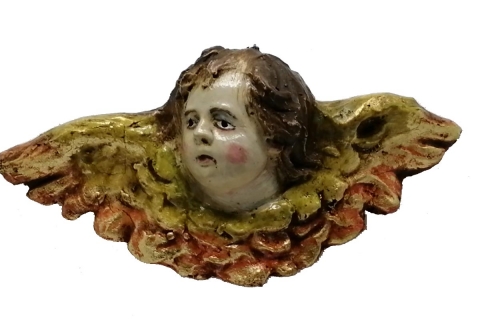 Head of a cherubic angel looking to the left made of polychrome clay. Measurements (L x H ) = 8.5 x 3.5 cm. Marshal Workshop.