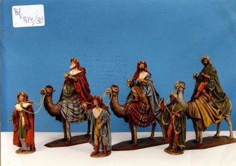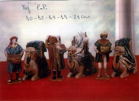 Grupo Reyes montados con pajes 6 piezas. Modelo 14099 en 14 cm. Diseño de Ángeles Camara realizado en pasta cerámica italiana y decorado con pintura acrílica.