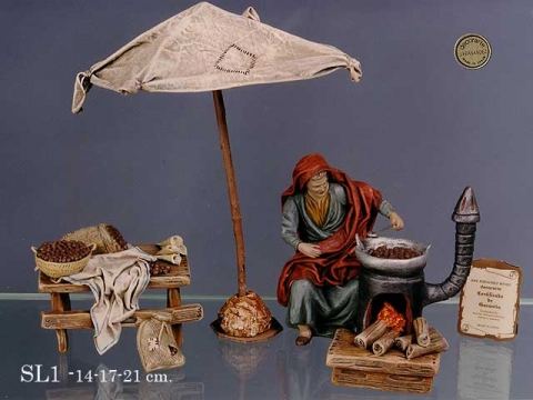 Chestnut seller with table into 4 pieces. SL1 Model en 14 cm.Design Decorarte in mud.