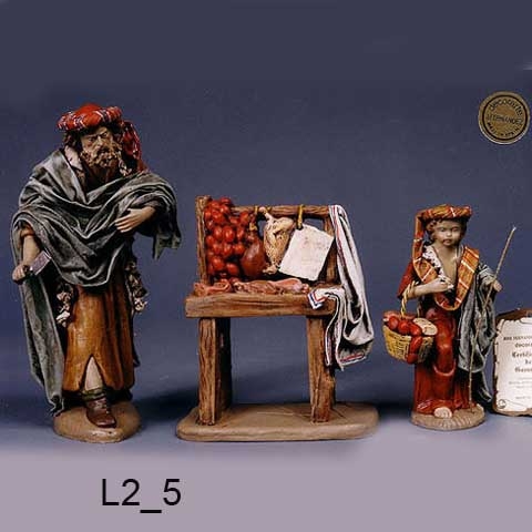 Grupo 5 : Pastor con niño en puesto de carne, Serie L2 de barro en 15 cm. Diseño de Decorarte.