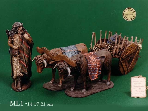 Shepherd with cart and oxen 4 pieces. Model ML1 at 21 cm .Design Decorarte in mud.