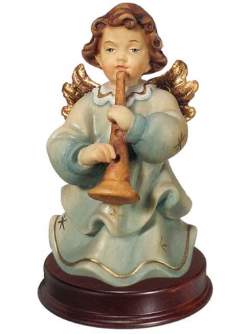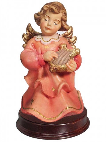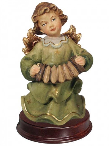 Angel en madera ligeramente policromada , caja de musica .Figura de 10cm.