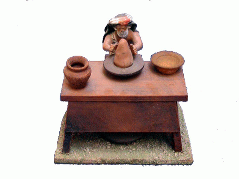 Grupo alfarero torneando con motor en barro con tela policromado de Belenes Galán en 21 cm.