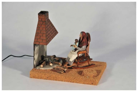 Pastora anciana con niño en mecedora con motor en barro con tela policromada de Belenes Galán en 21 cm.