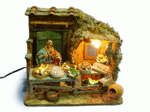 Scene Shepherd selling fish in Fishmarket with light and with movement in 14 cm.