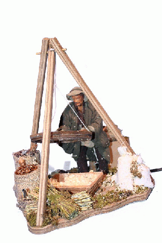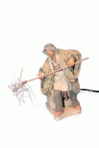 Pastora moliendo harina con motor en barro con tela policromado de Belenes Galán en 14 cm.