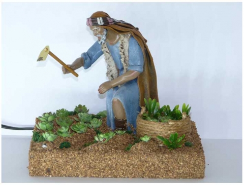 Pastor hortelano con motor en barro con tela policromada de Belenes Galán en 14 cm.