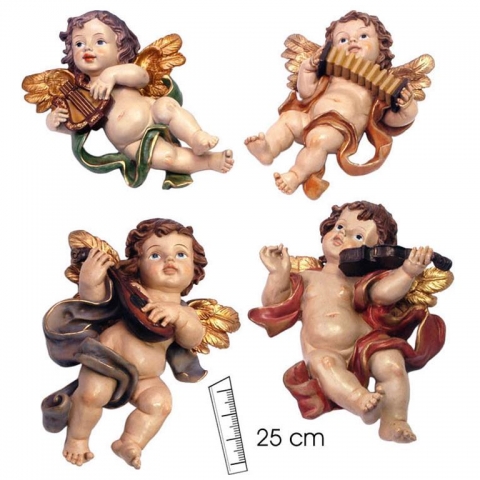 Juego de 4 angeles para colgar de 25 cm. Medidas:18x10x25cms. Diseno de Giordano de Ponzano realizado en resina policromada
