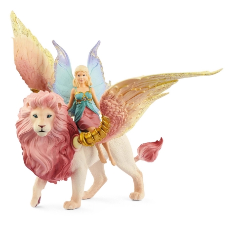 El hada y el león alado. Modelo de Schleich. Dimensiones: 16 x 31,5 x 12,5 cm (W x D x H). Edad recomendada 5-12 Años Funciones : Sillita imantada , lkeón con alas móviles ycon brazo aerticulado.