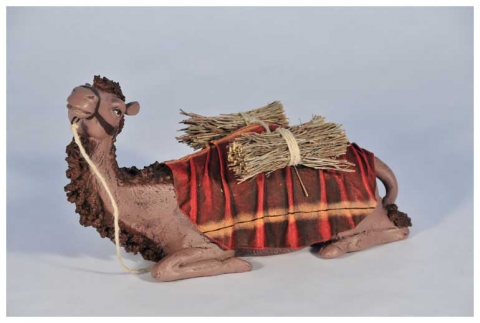 Camello tendido lienzado en barro policromada. Diseño de Belenes Galán.Disponible en varias medidas.