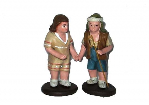 Niño y niña de la mano de Almansa . barro en 12 cm.