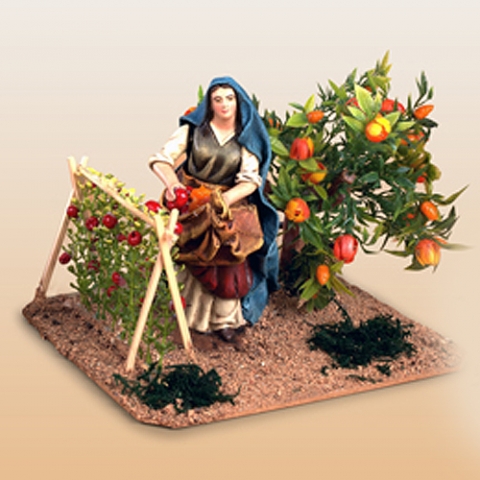 Pastora cogiendo tomates con movimiento 14 cm. Diseño de Serrano en barro.