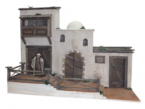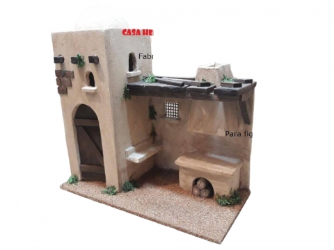 Hebrew house with cantilever supported by beams for 12-14 cm figures. Measurements: (LxWxH): 30x19x31 cm. Made of wood. Orientative photo due to the artisanal nature of the piece.