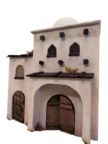 Moorish house with entrance for 12-14 cm figures. Measurements (LxWxH): 32x20x40. Door height 14.5 cm. Made of wood. Photo is for guidance only due to the handmade nature of the piece.