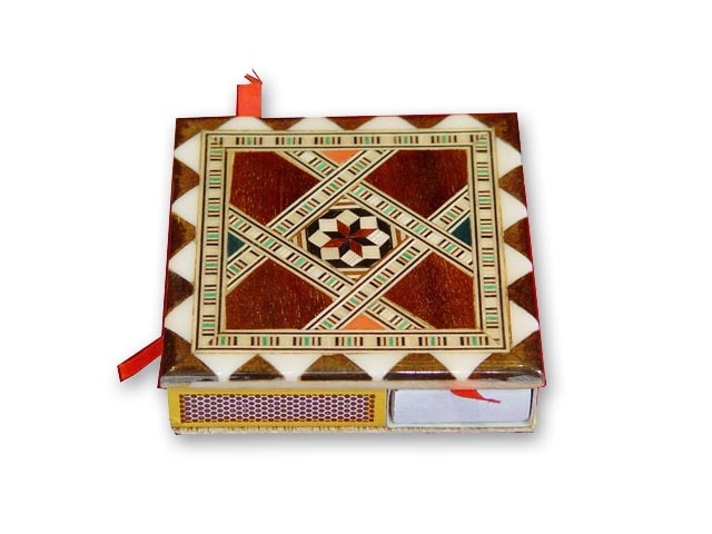 Funda taracea para cuatro cajas de cerillas. 9X9 cm.