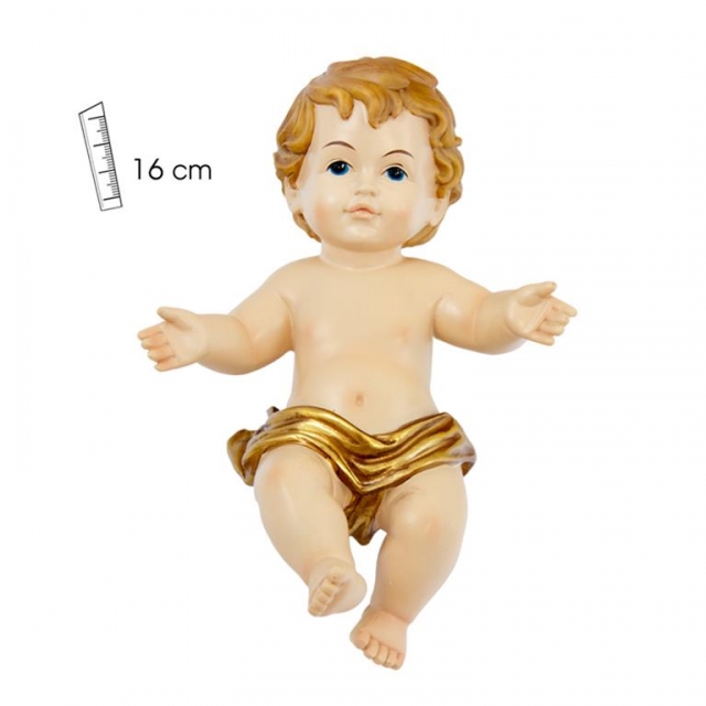Baby Jesus with golden diaper in 16cm of polychrome resin. Design by Giordano de Bonzano. Measurements: 10x16x6 cms.