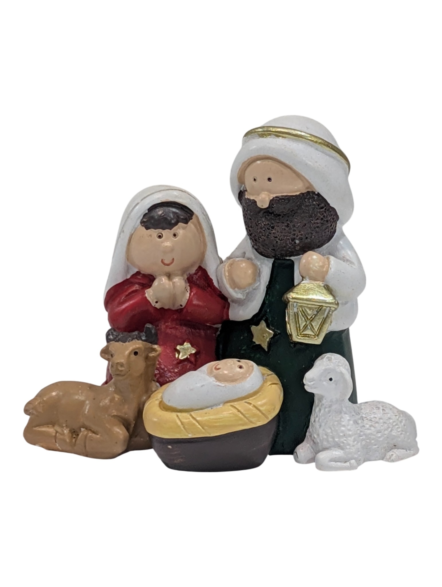 Resin Nativity Scene 6x7cm Holy Family Child Saint Joseph with lantern and Virgin Mary hands clasped with animals