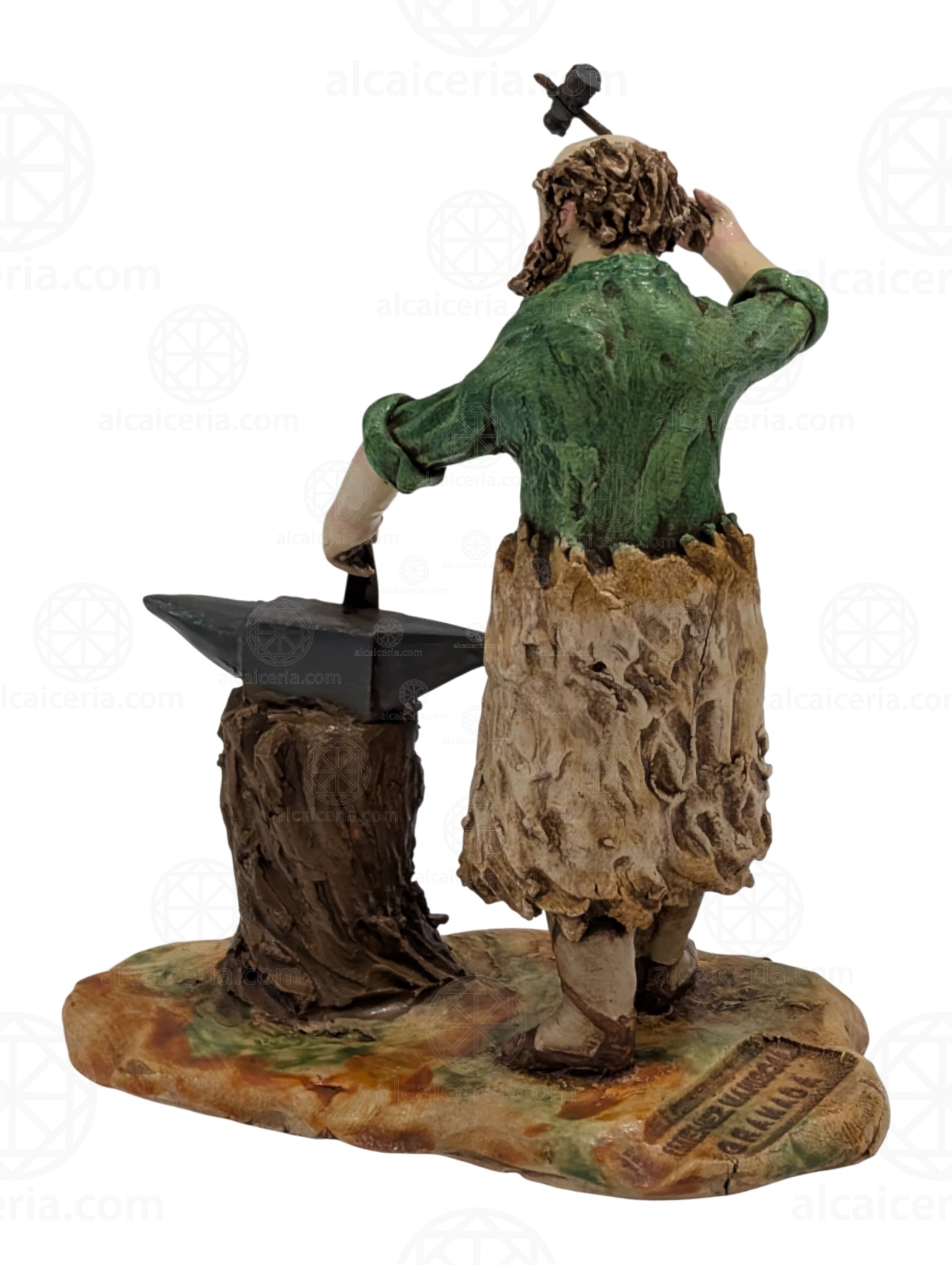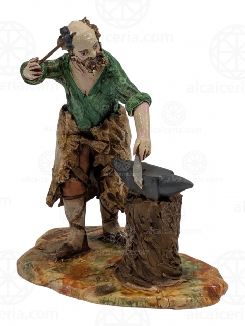 Blacksmith on anvil, 15 cm. Made of polychrome clay by the "Artesania Mariscal" workshop in Granada. This photo is indicative due to its artisanal nature.