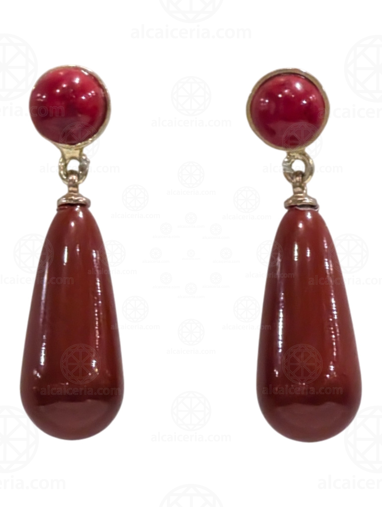 Pendientes lágrima coral, de plata de ley chapados en oro. Medidas 35x10 mm.
