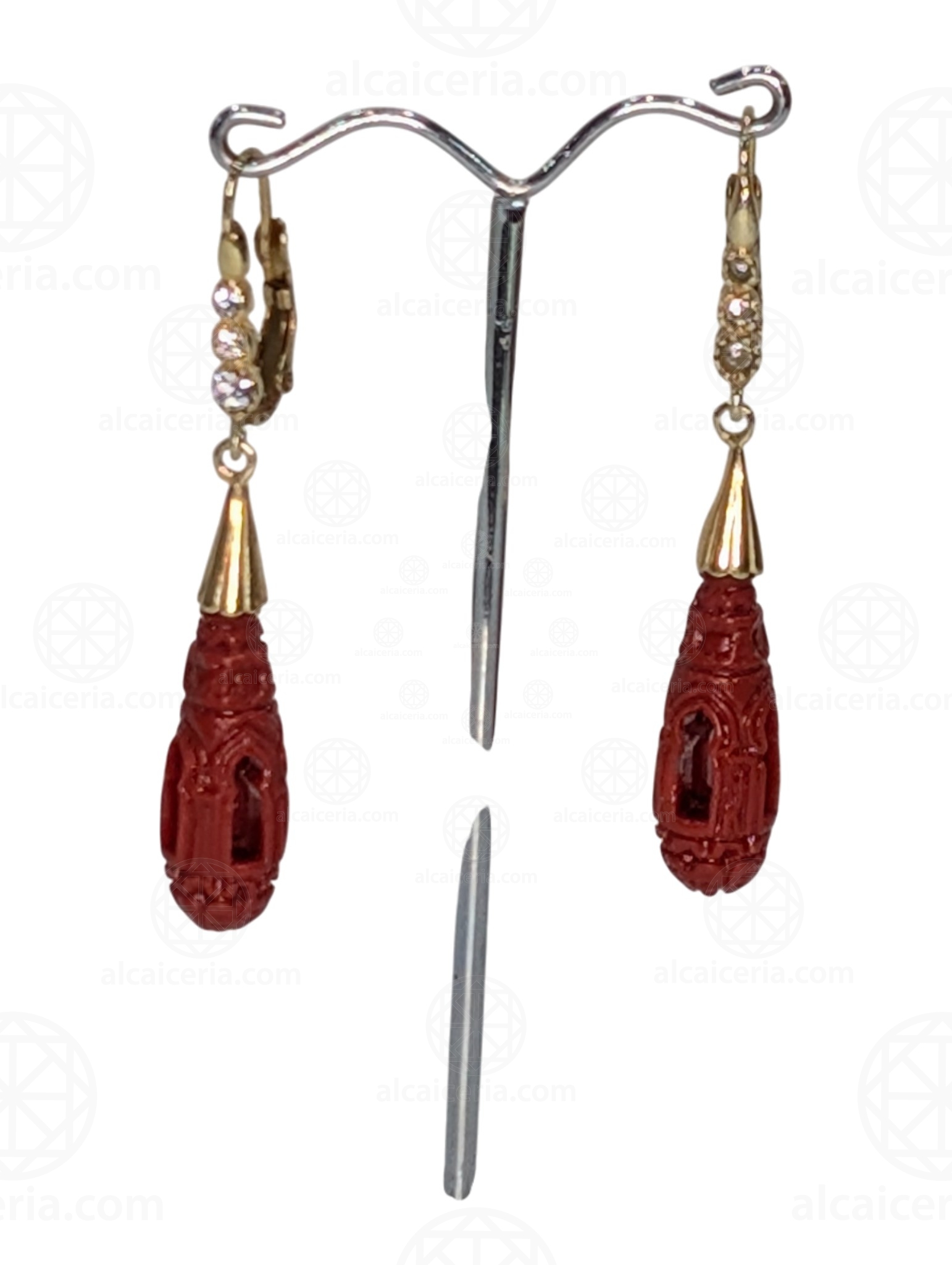 Pendientes lágrima coralina con arcos, de plata de ley chapados en oro. Medidas 60 mm h.