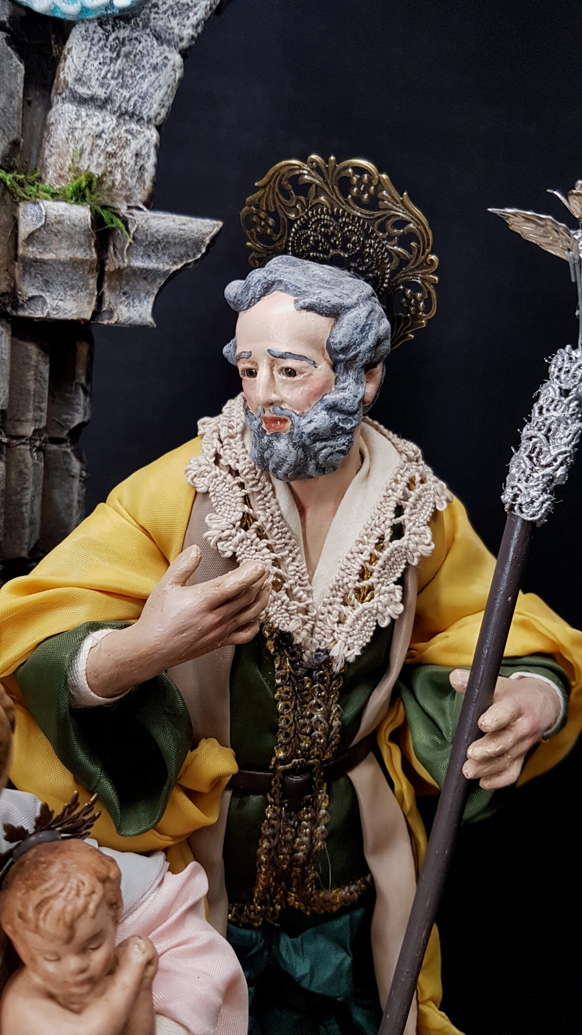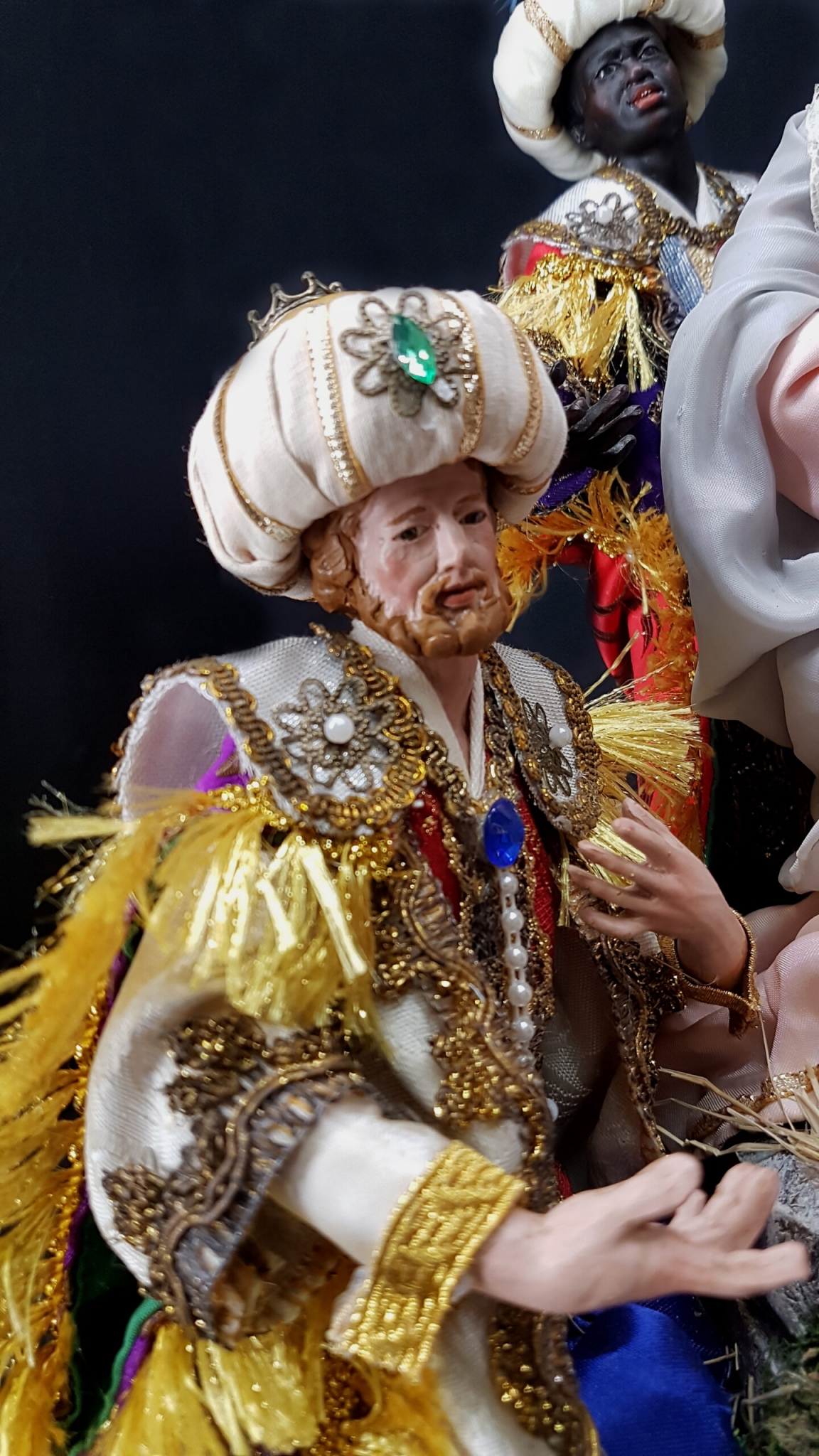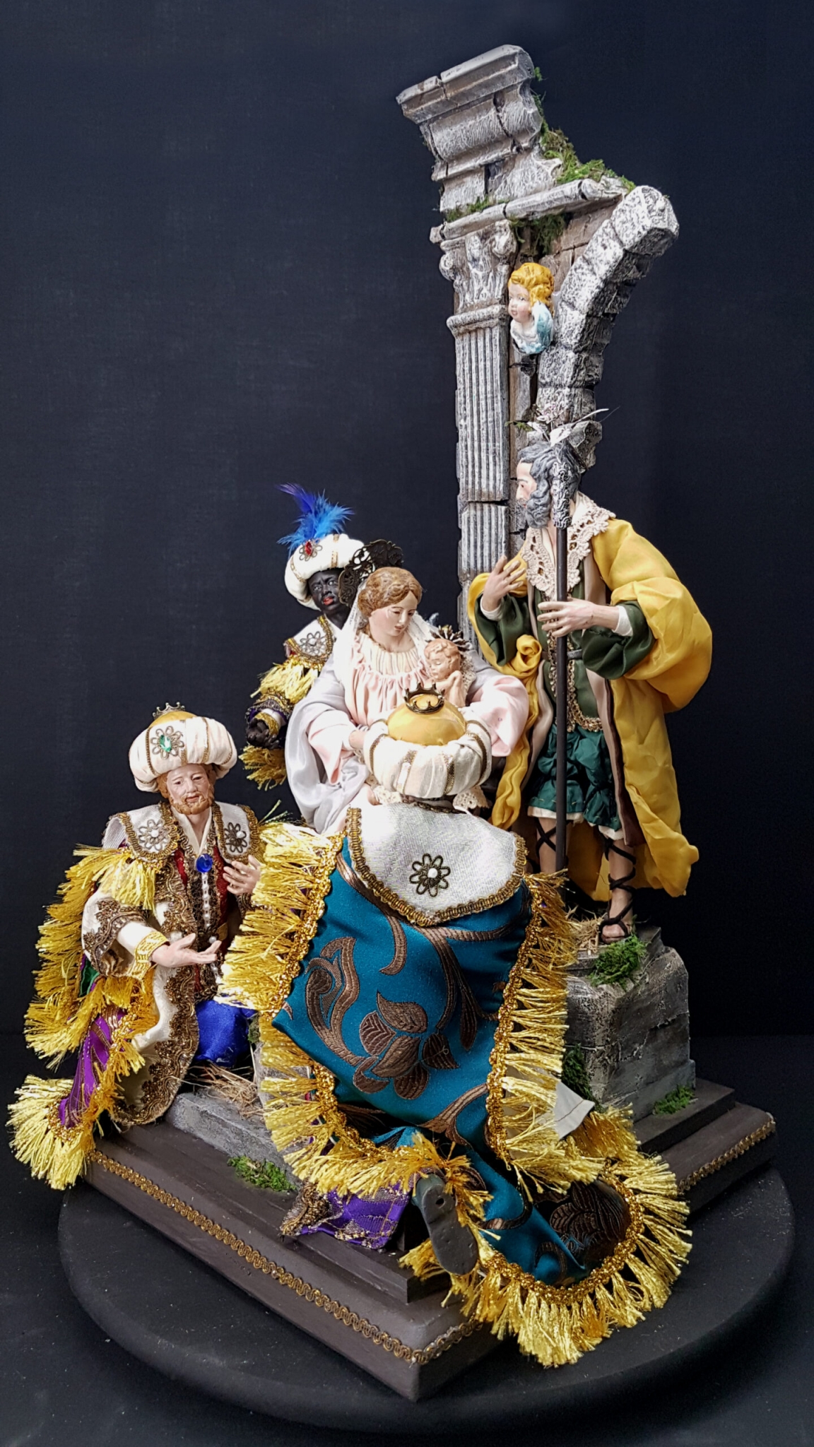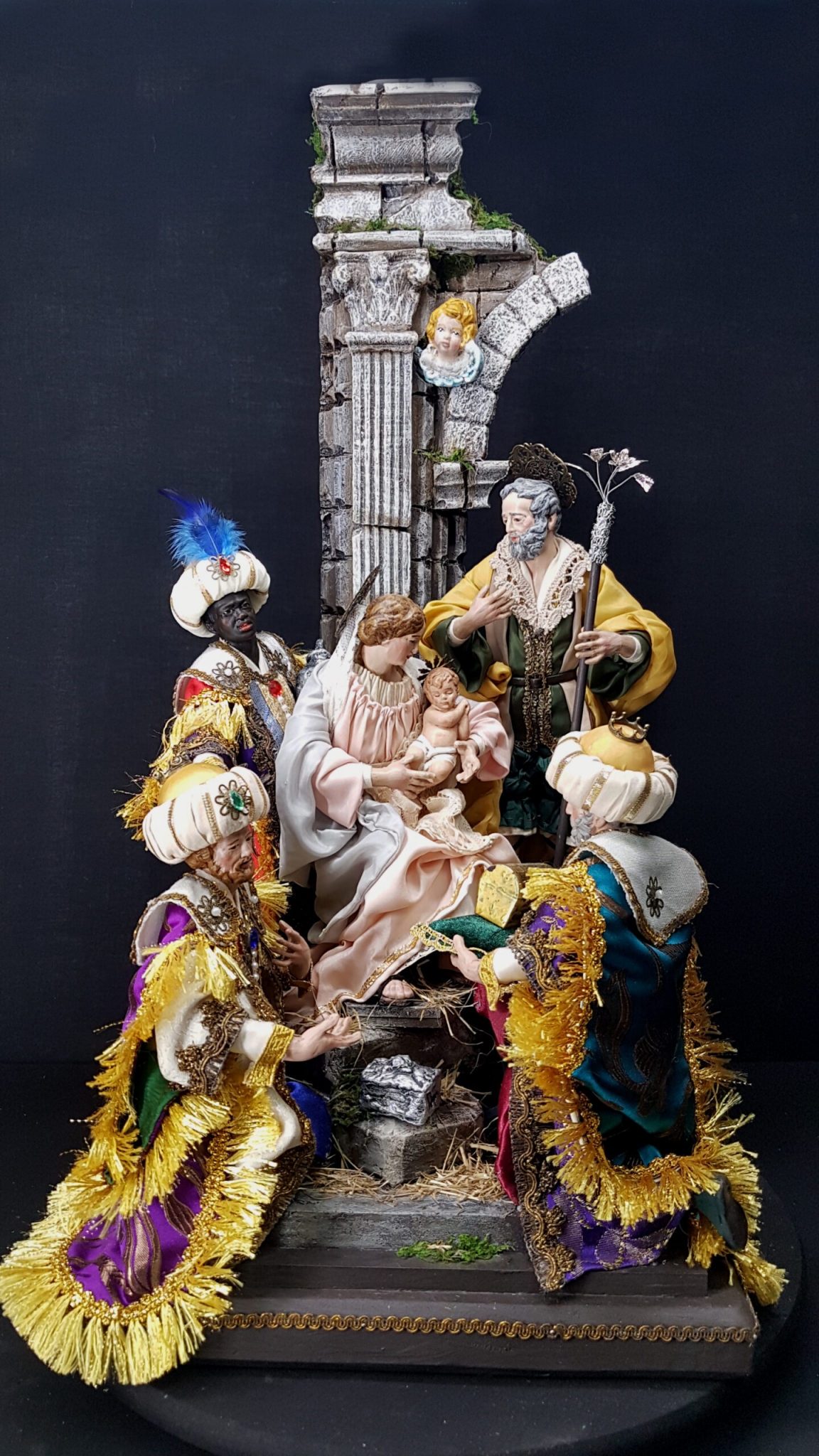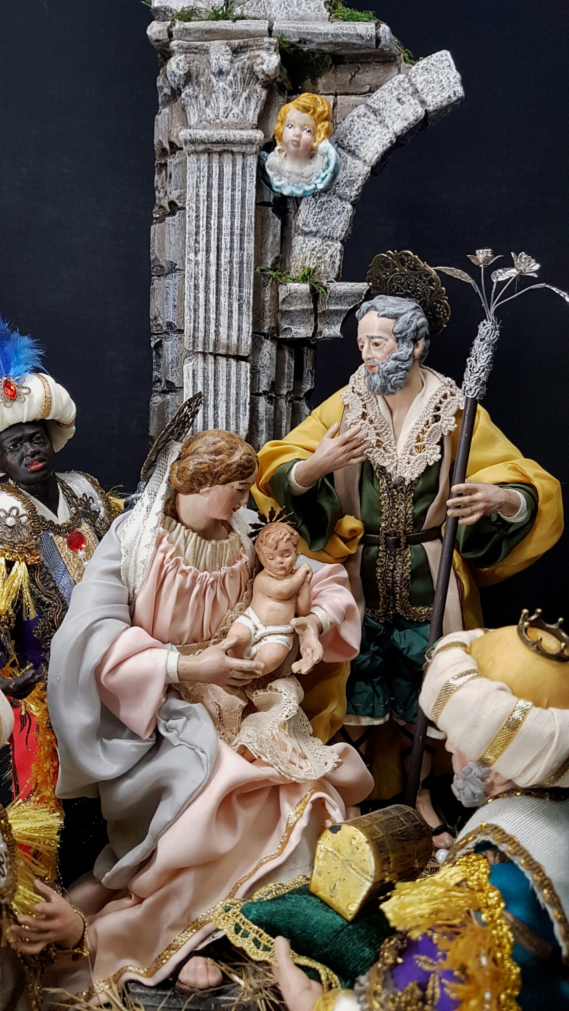 Natividad con peana y arquitectura renacentista. Hermosa obra de artesanía, la Virgen, San José están realizados de acuerdo con la tradición y vestidos como los antiguos pastores en el estilo napolitano del 700. Las cabezas, las manos y los pies son de terracota con la incorporación de los ojos de cristal, con maniquí de estopa vestido con tela de seda. El Niño Jesús está hecho completamente de terracota con la incorporación de los ojos de vidrio. Pintura ejecutada totalmente a mano con pintura al óleo al estilo napolitano del siglo XVIII. Hecho en Nápoles con certificado de autenticidad.