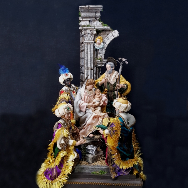 PESEBRE DI SAN BIAGGIO DEI LIBRARI 25/28 CM WITH KING Nativity with pedestal and Renaissance architecture. Beautiful work of craftsmanship, the Virgin, Saint Joseph are made according to tradition and dressed as the ancient shepherds in the Neapolitan style of the 700. Measurement of the crib: height 57 cm, width 26 cm, depth 28 cm.
