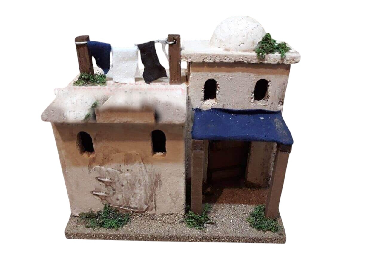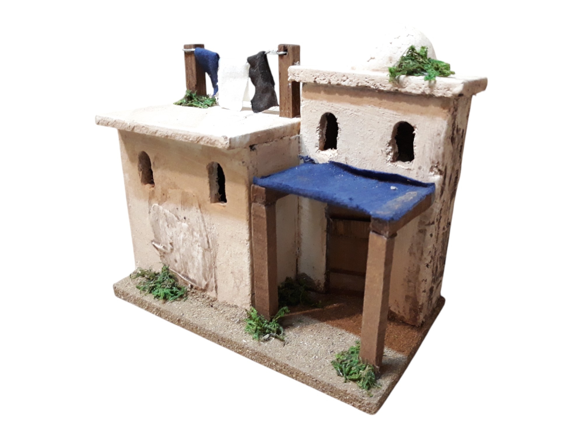 Casa morisca con tendedero para figuras de 5 a 7 cm y para lejanía. Medidas: 18x10x16 cm. Realizada en madera. Foto orientativa debido al carácter artesanal de la pieza.
