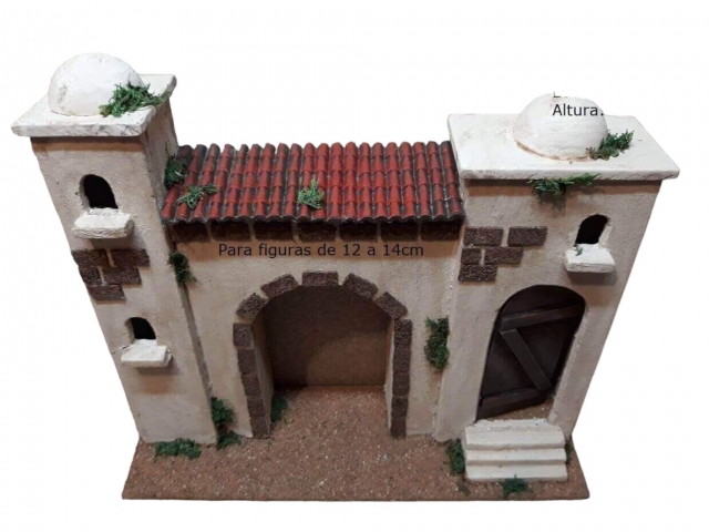 House with entrance arch for 12-14 cm figures. Measurements: (LxWxH): 38x11x34 cm. Made of wood. Orientative photo due to the artisanal nature of the piece.