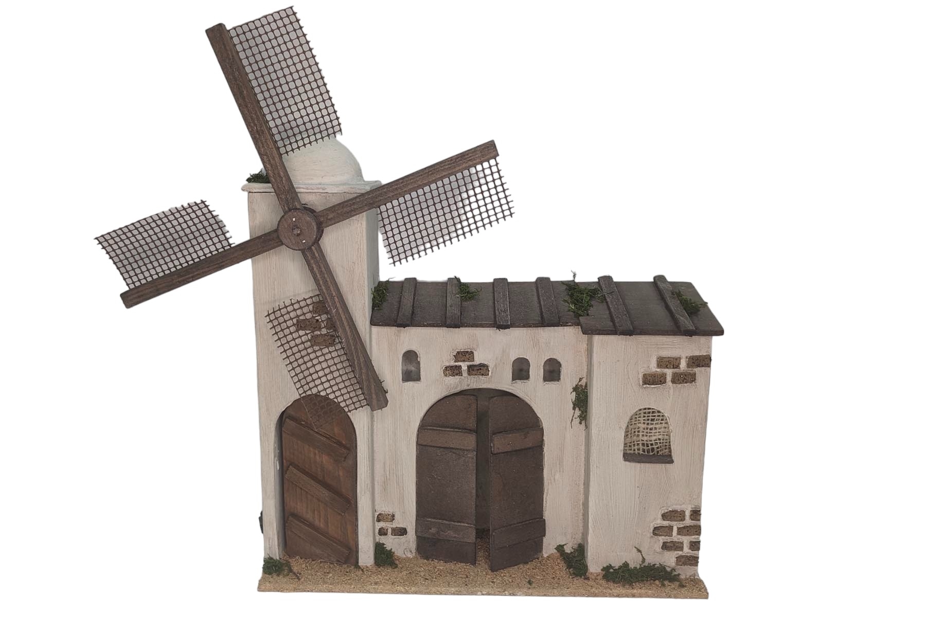 Windmill with wooden blades for 12-14 cm figures. Measurements: (LxWxH): 35x11x37 cm. Made of wood. Orientative photo due to the artisanal nature of the piece. The blades rotate, with motor included