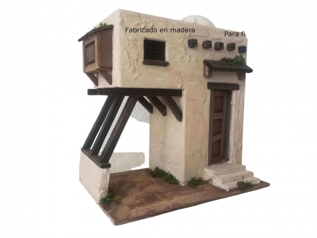 Hebrew house with cantilever supported by beams for 12-14 cm figures. Measurements: (LxWxH): 30x19x31 cm. Made of wood. Orientative photo due to the artisanal nature of the piece.