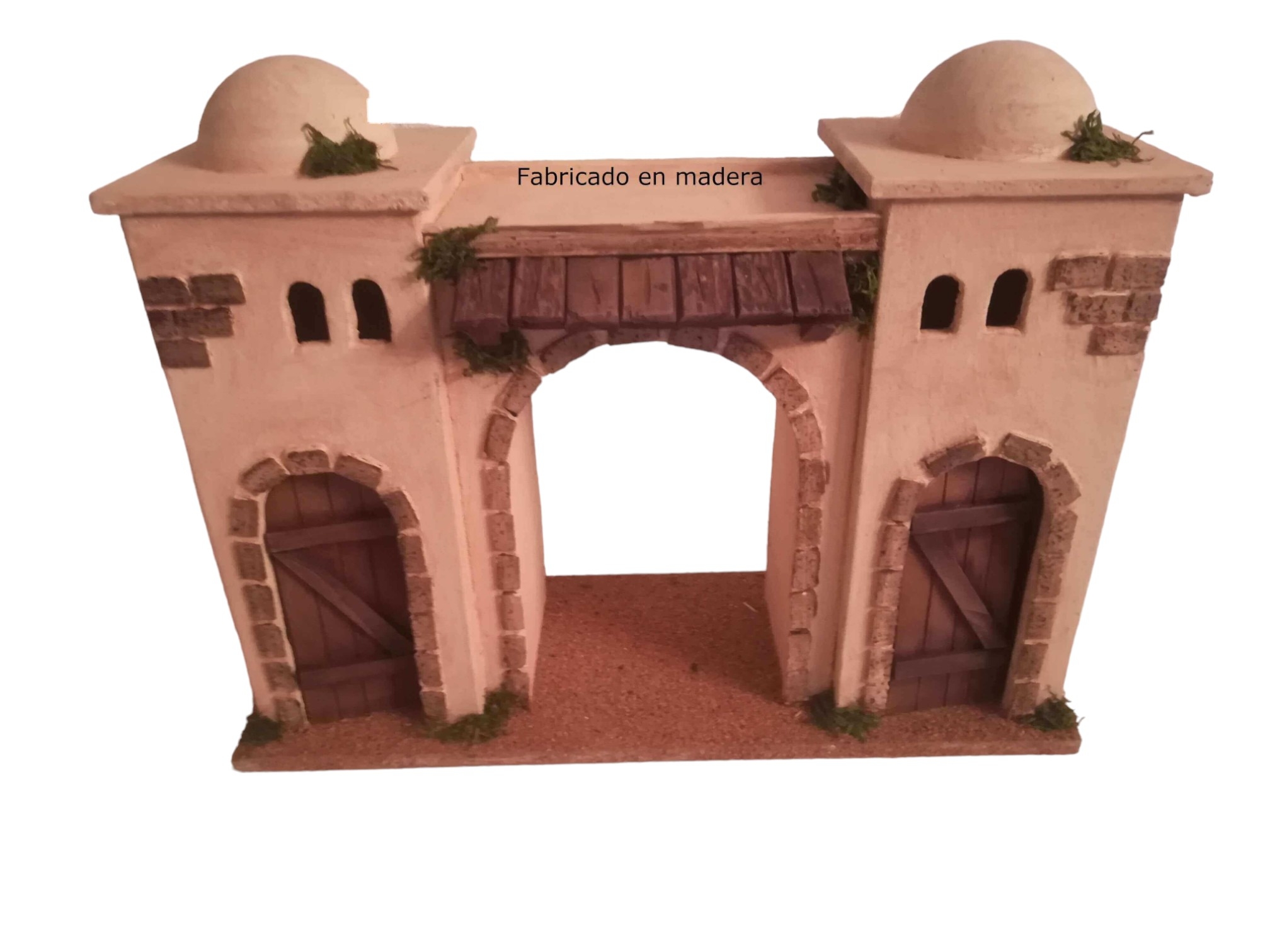 Entrance to Bethlehem for 10-12 cm figures. Measurements: (LxWxH):35x12x26. Arch height of 17 cm. Made of wood. Orientative photo due to the artisanal nature of the piece.