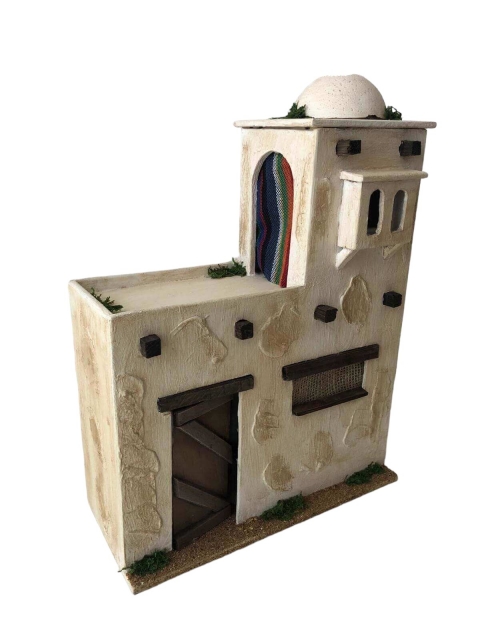 Arab house with two floors for 10-12 cm figures. Measurements: (LxWxH): 28x12x38 cm. Made of wood. Orientative photo due to the artisanal nature of the piece.