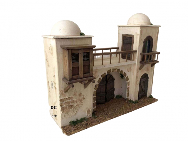 House with central gate for 10-12 cm figures. Measurements: (LxWxH): 46x16x39 cm. Made of wood. Orientative photo due to the artisanal nature of the piece.