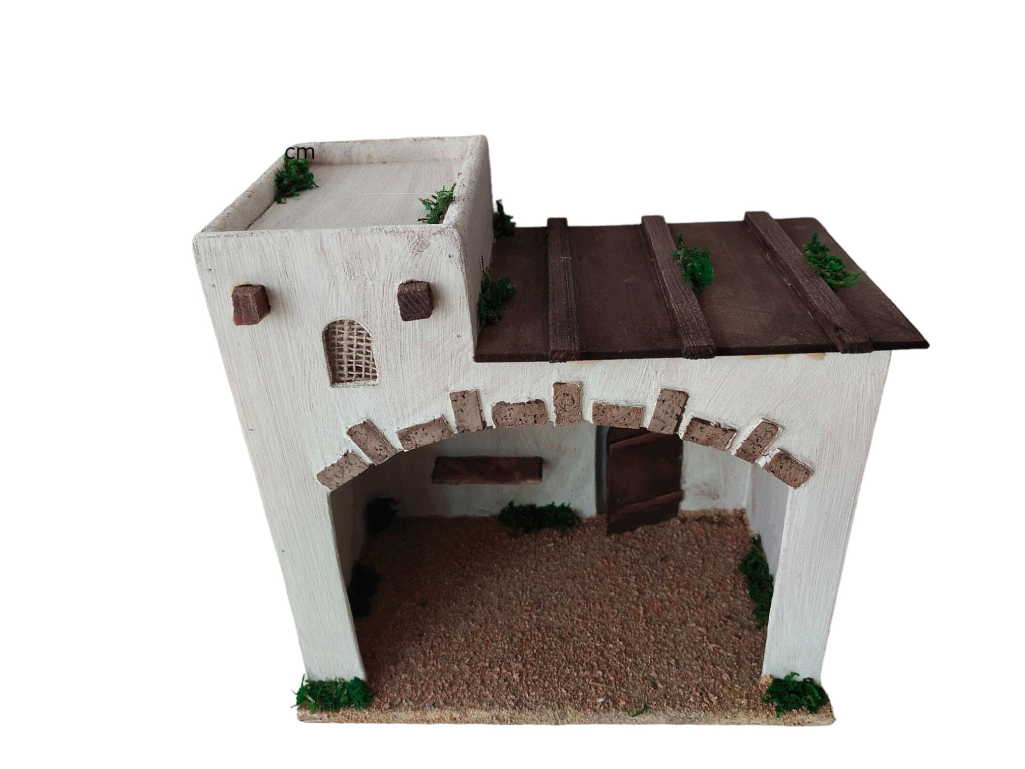 Portal with house for 8-10 cm figures. Measurements: (LxWxH): 27x15x25 cm. Made of wood. Orientative photo due to the artisanal nature of the piece.