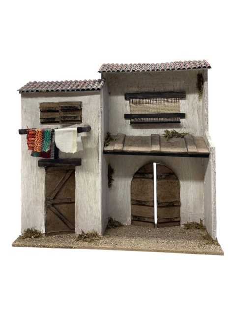 Rustic facade with clothesline for 10-12 cm figures. Measurements (LxWxH): 35x11x33 cm. Door height 12.5 cm. Made of wood. Photo is for guidance only due to the handmade nature of the piece.